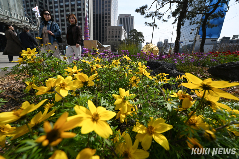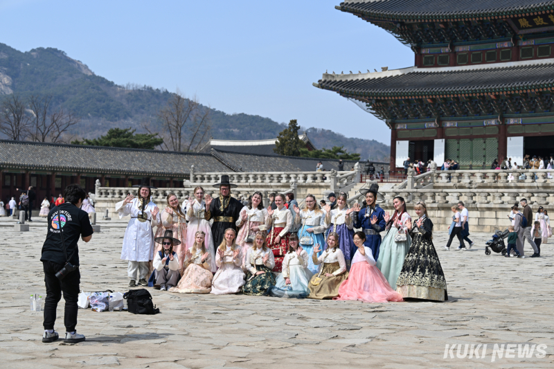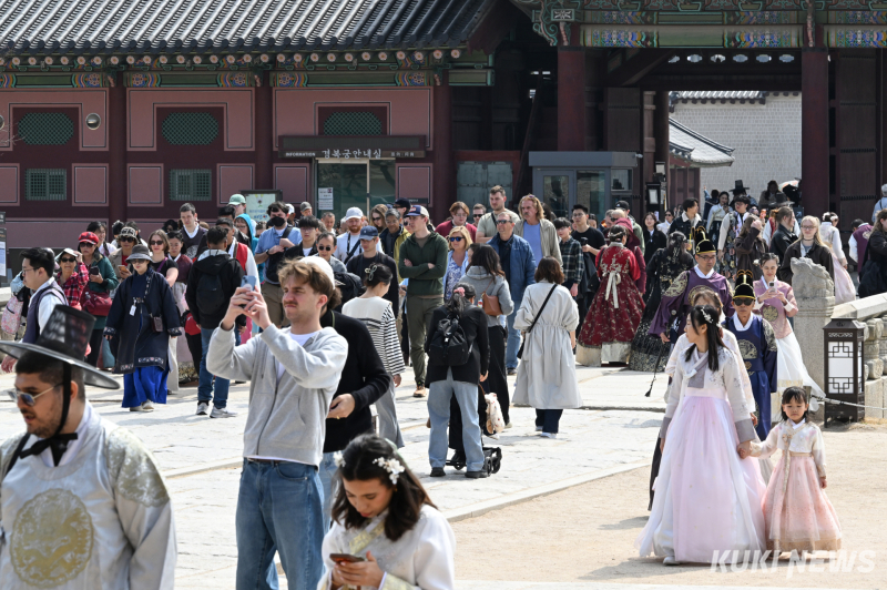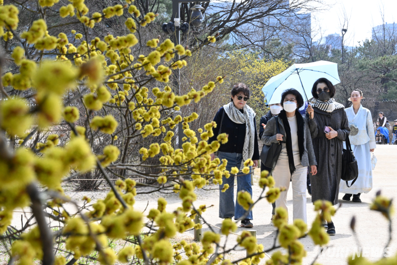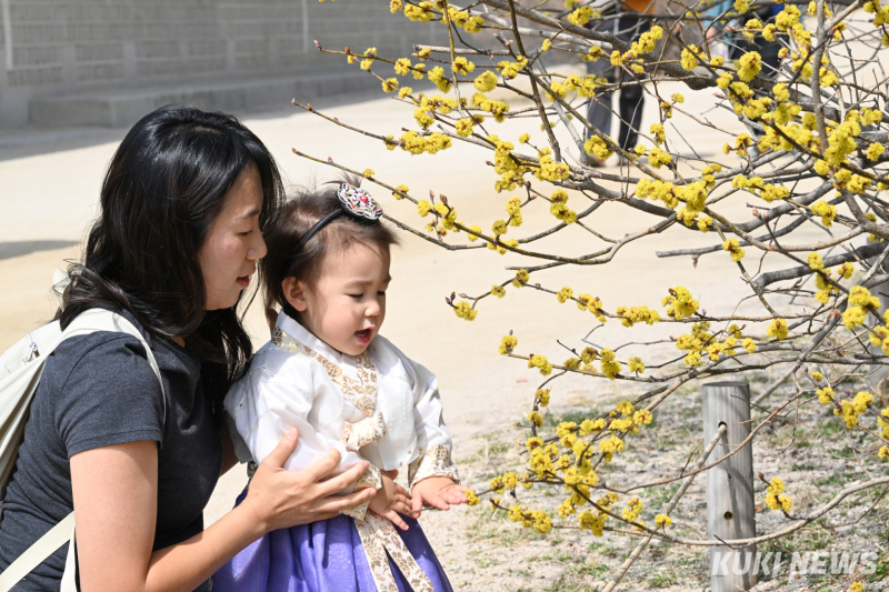 한낮 기온이 19도를 기록한 23일 오후, 경복궁과 광화문 일대는 봄을 만끽하려는 시민들과 외국인 관광객들로 북적였다. 한복을 입고 궁을 찾은 외국인 관광객들과 가족 나들이에 나선 시민들은 경복궁 곳곳에 핀 봄꽃을 구경하며 산책하거나 기념사진을 찍었다.