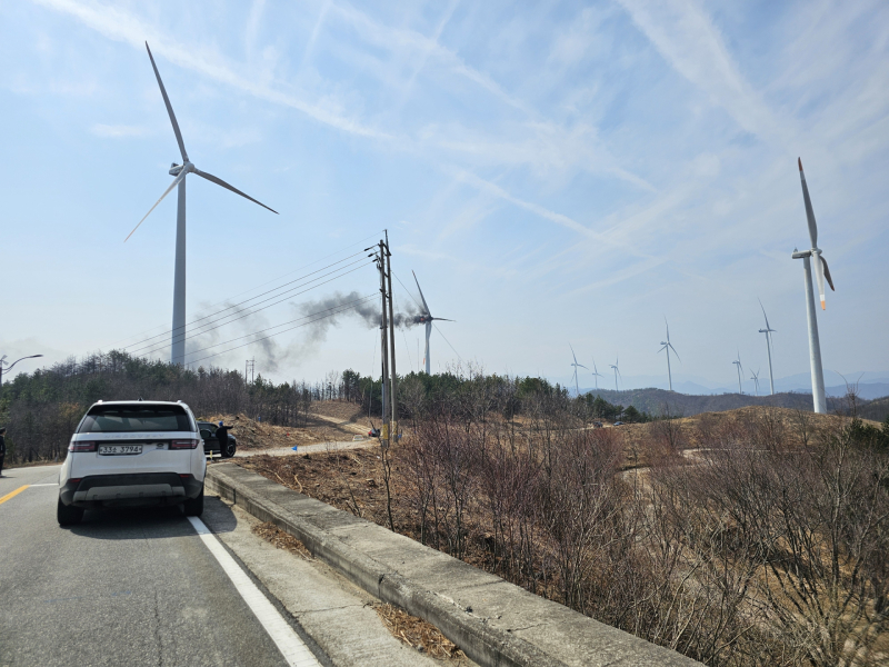 인근 도로는 풍력발전기 날개 잔해 등의 낙하 우려로 통제된 상태다.