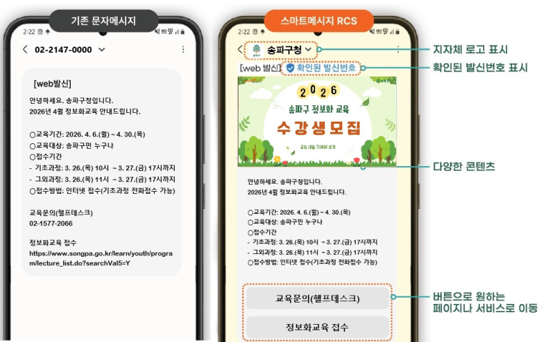 이에 지자체들도 대응에 나섰다. 서울 송파구는 지난 20일 ‘RCS 안심문자 서비스’를 도입한다고 밝혔다. RCS(Rich Communication Services)는 국제 표준 메시지 규격을 적용한 서비스다. 이미지와 전용 버튼 등을 활용해 문자메시지에서도 발신자 정보와 프로필을 시각적으로 확인할 수 있다.