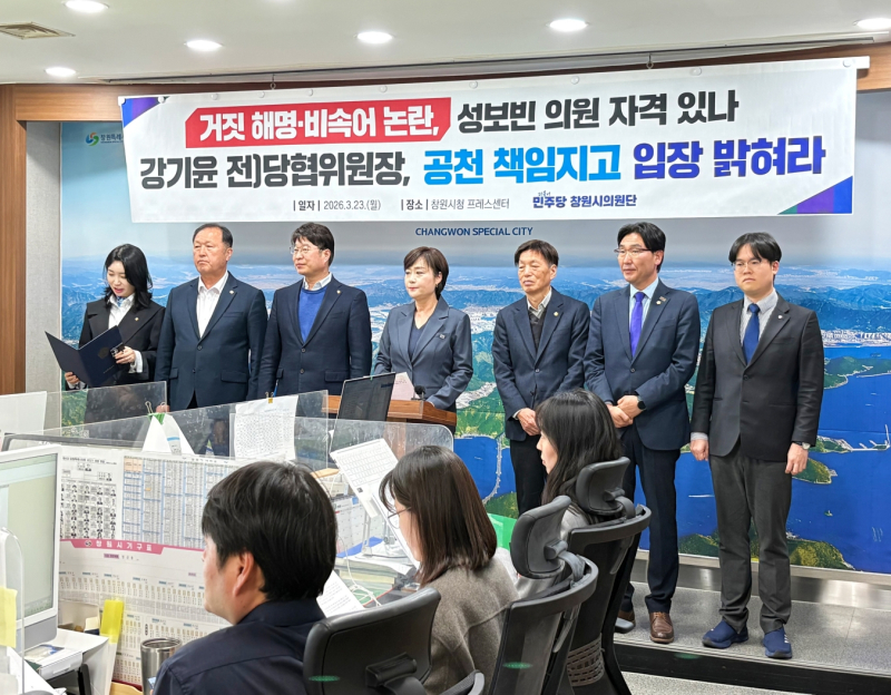 창원시의회 민주당 의원단은 23일 창원시청 프레스센터에서 기자회견을 열고 성보빈 의원의 기부행위 의혹과 해명 번복, 비속어 논란 등을 지적하며 “공직자로서의 신뢰와 품위를 심각하게 훼손했다”고 밝혔다.