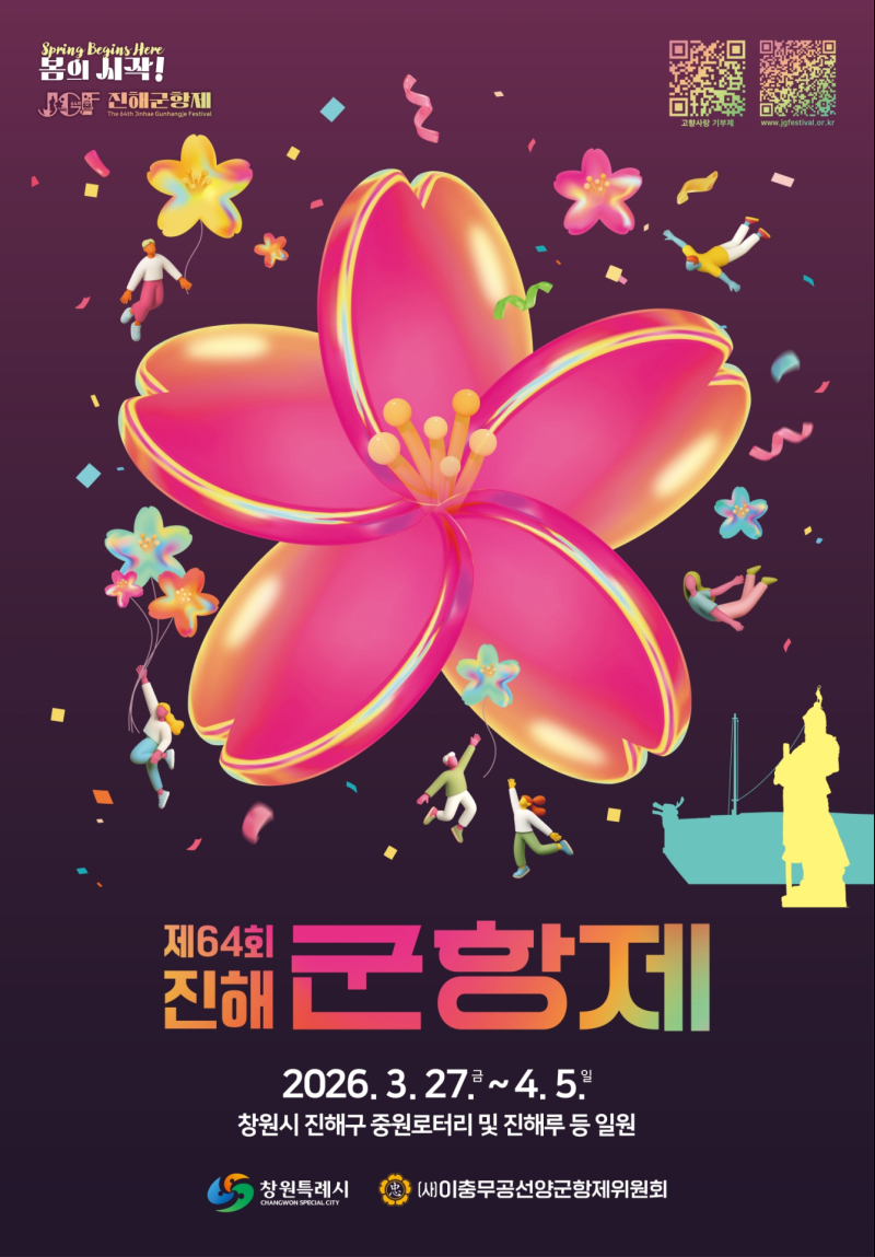 창원특례시는 제64회 진해군항제를 진해구 전역에서 개최하고 ‘봄의 시작’을 슬로건으로 체류형·참여형 축제로 운영한다. 올해는 기존 관람 중심에서 벗어나 체험과 야간 콘텐츠를 강화해 방문객이 머무르는 축제로 전환하는 것이 핵심이다.