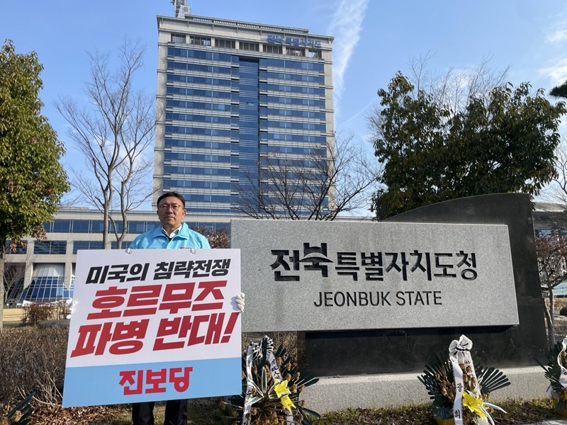 백승재 진보당 전북도지사 출마예정자가 24일 미국의 이란 침략전쟁에 한국 정부의 호르무즈 해협 파병 반대를 촉구하는 긴급성명을 발표하고 전북특별자치도청 앞 일원에서 1인 시위에 나섰다.