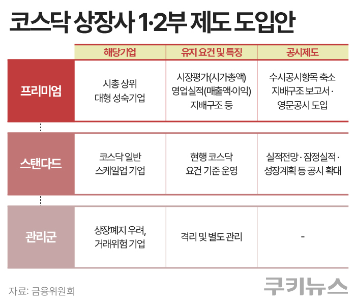 코스닥 시장 신뢰 제고를 위한 금융당국 주도의 개혁안이 속도를 내고 있다. 코스닥 상장사를 성과에 따라 구분해 상위 기업만 모은 ‘프리미엄 리그’와 일반 기업 중심의 ‘스탠다드’로 나누는 승강제를 도입하기로 했다. 시장에서는 지배구조 검증이 프리미엄 리그 안착의 성패를 가를 핵심 변수로 지목되는 가운데 ‘2부 리그’ 낙인효과가 자칫 상장사에 부담으로 작용할 수 있다는 우려도 제기된다.
