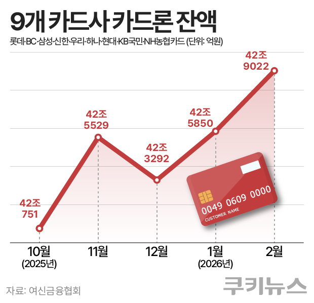 24일 여신금융협회에 따르면 9개 신용카드사(롯데·BC·삼성·신한·우리·하나·현대·KB국민·NH농협카드)의 2월 말 카드론 잔액은 42조9022억원으로 전월 말보다 3171억원 증가했다. 카드론 잔액은 지난해 9월 41조8375억원에서 10월 42조751억원, 11월 42조5529억원으로 두 달 연속 증가했다. 이후 연말 가계대출 관리 기조 영향으로 소폭 감소했으나, 다시 증가세로 전환되며 수요가 이어지는 모습이다.