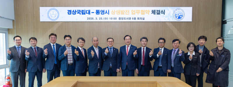 경상국립대와 통영시는 25일 오전 경상국립대 가좌캠퍼스 중앙도서관에서 '상생발전을 위한 업무협약(MOU)'을 체결하고, 이를 실행할 '통영시–경상국립대 상생발전 공동협의체' 발족을 추진한다고 밝혔다.