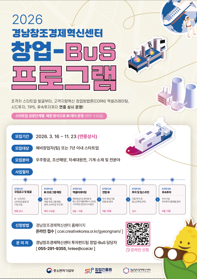경남창조경제혁신센터는 2026년 ‘창업-BuS(Build-up Strategy for Startup)’ 프로그램을 통해 유망 스타트업을 발굴하고 투자 유치까지 이어지는 전주기 지원을 추진한다.