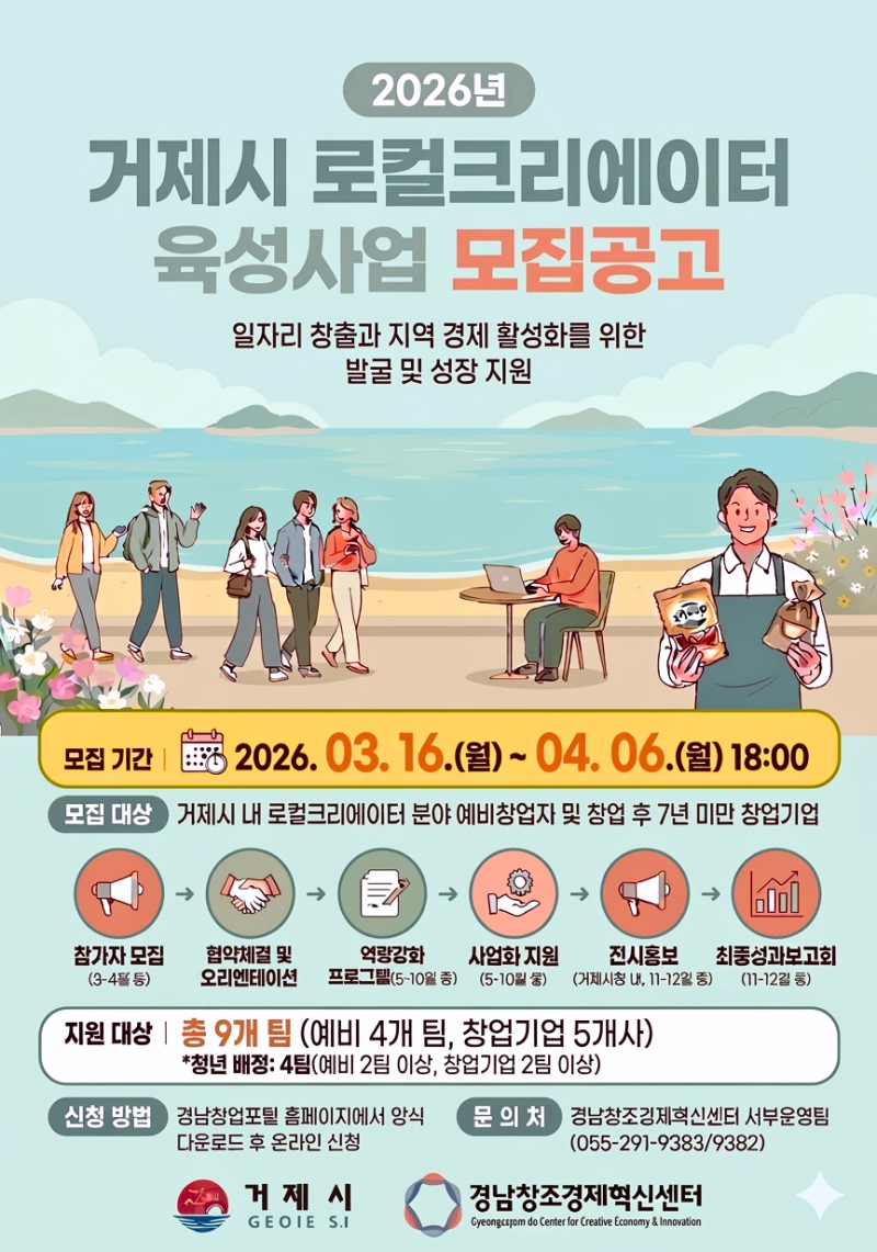 경남창조경제혁신센터는 ‘2026년 거제시 로컬크리에이터 육성사업’ 참여자를 오는 4월 6일까지 모집한다.