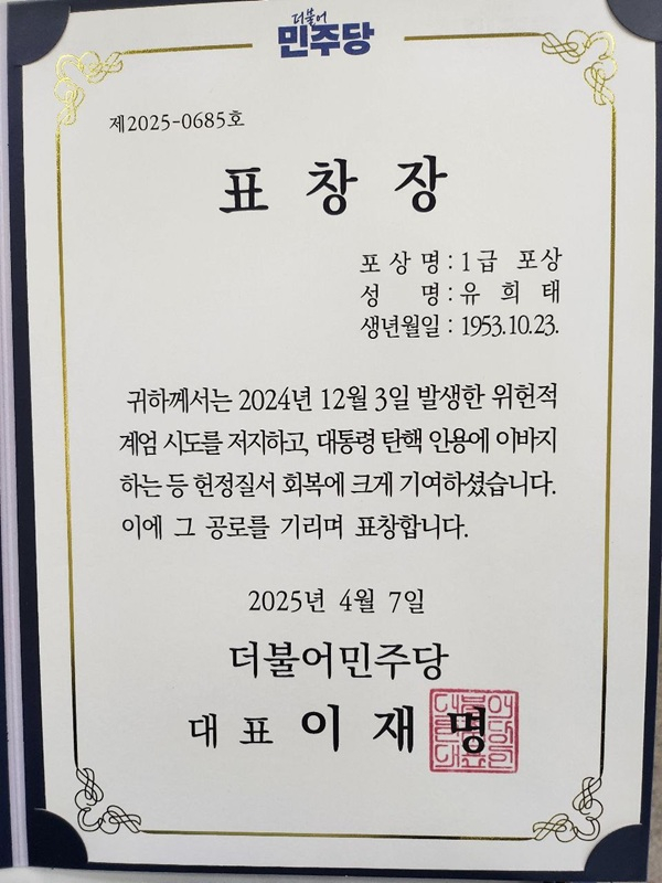 유희태 완주군수는 해당 사안과 관련해 지난해 4월 7일 헌정질서 회복에 기여한 공로를 인정받아 더불어민주당으로부터 1급 포상을 받았다. 표창장에는 ‘2024년 12월 3일 발생한 위헌적 계엄 시도를 저지하고 대통령 탄핵 인용에 이바지하는 등 헌정질서 회복에 크게 기여했다’는 내용이 담겼다.