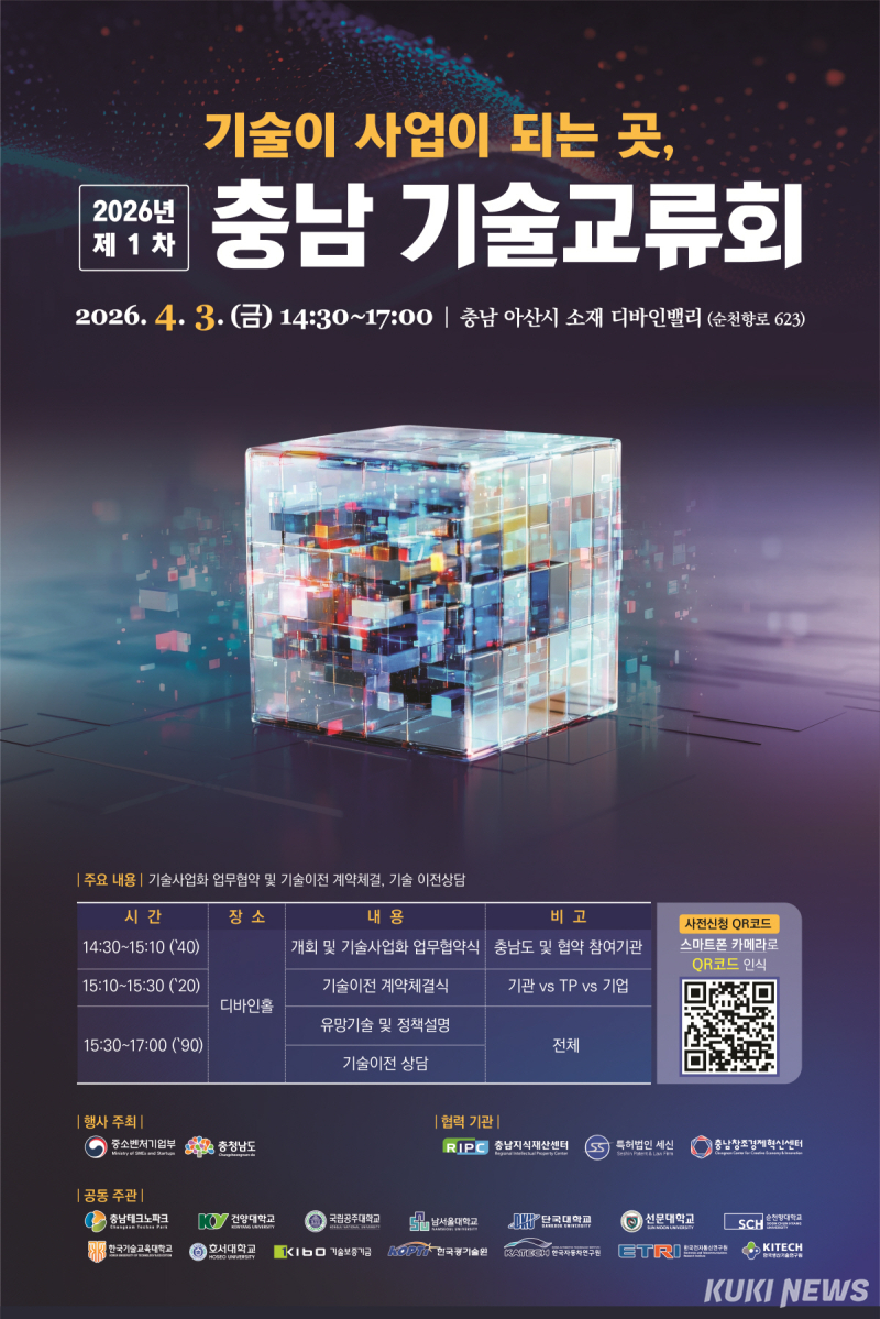 충남테크노파크는 오는 4월 3일 충남 아산시 디바인밸리에서 산·학·연 협력 기반의 기술사업화 촉진을 위한 ‘2026년 제1차 충남 기술교류회’를 개최한다고 26일 밝혔다.