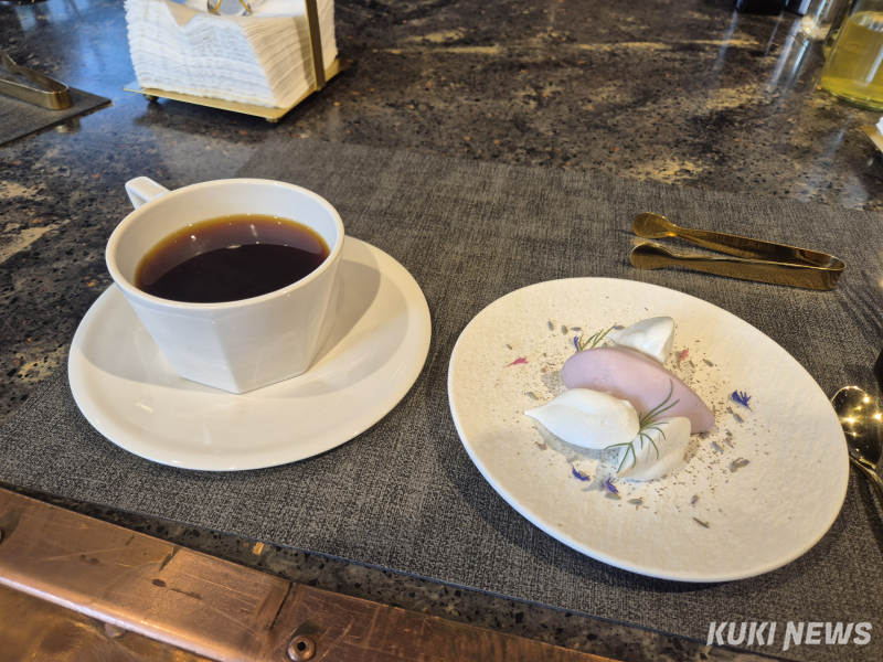함께 제공된 디저트는 라벤더 머랭이다. 가볍게 부서지는 식감과 은은한 단맛이 커피의 산미와 자연스럽게 어우러지며, 플로럴 계열 향을 한층 더 길게 이어주는 역할을 했다.