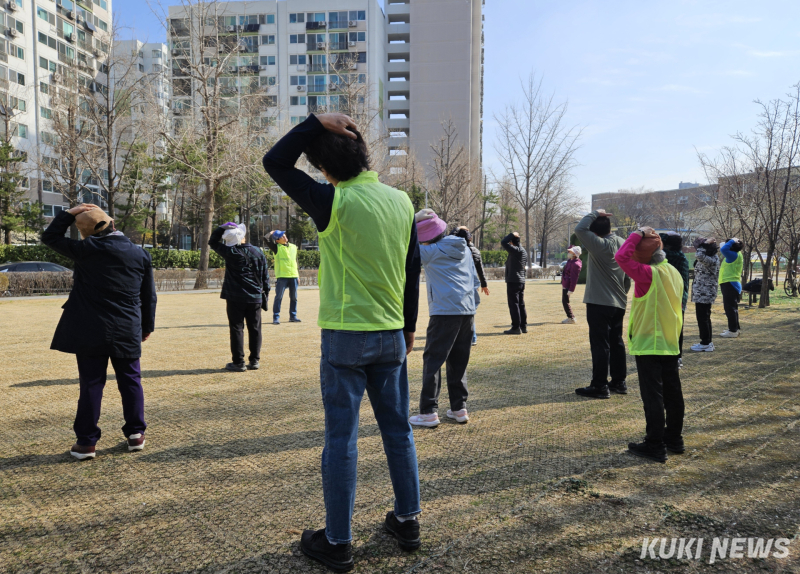 이날 현장은 14도의 화창한 날씨 속에서 진행됐다. 오전 9시30분부터 어르신들이 하나둘 모이기 시작해 50분쯤에는 총 9명이 참여했다. 이들이 가장 먼저 시작한 것은 무릎 돌리기였다. 이어 다리 펴기와 발끝 돌리기 등 준비운동이 이어졌다. “이번엔 바깥쪽으로!”라는 지도자의 힘찬 구호가 현장에 울려 퍼졌다.