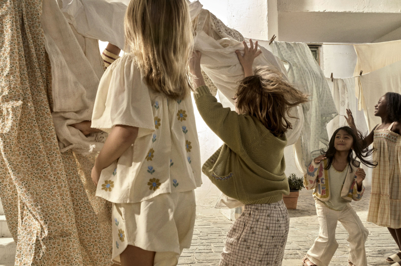 아동복 라인은 수공예적 감성과 실용성을 결합한 방향이다. 크로셰 니트, 패치워크, 자수 디테일 등 장식 요소를 활용하면서도, 리넨 팬츠와 루즈한 실루엣을 통해 활동성을 확보했다. 민트, 피치, 옅은 블루 등 바랜 듯한 컬러 팔레트를 유지하며 전체 컬렉션과의 연결성도 이어간다.