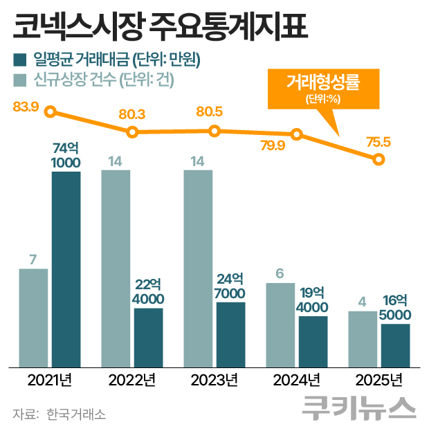이는 2021년 이후 이어진 감소 흐름의 연장선이다. 일평균 거래대금은 2021년 74억1000만원에서 △2022년(22억4000만원) △2023년(24억7000만원) △2024년(19억4000만원)으로 급감했다. 거래형성종목수와 거래형성률도 △2021년(114종목·83.9%) △2022년(102종목·80.3%) △2023년(104종목·80.5%) △2024년(99종목·79.9%)으로 감소세를 보였다. 신규 상장 역시 2021년 7건에서 2022년과 2023년 각각 14건으로 늘었다가 2024년 6건으로 다시 줄었다.