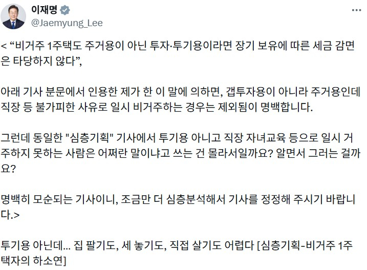 이 대통령은 이날 엑스(X·옛 트위터)에 비거주 1주택자의 어려움을 다룬 기사를 공유하며 이같이 밝히고, 일부 보도 내용에 대해 정정을 요청했다. 해당 기사에는 토지거래허가구역 등에서 주택을 보유한 비거주 1주택자들이 매매·임대·실거주 모두 쉽지 않은 ‘3중고’를 겪고 있다는 내용이 담겼다.