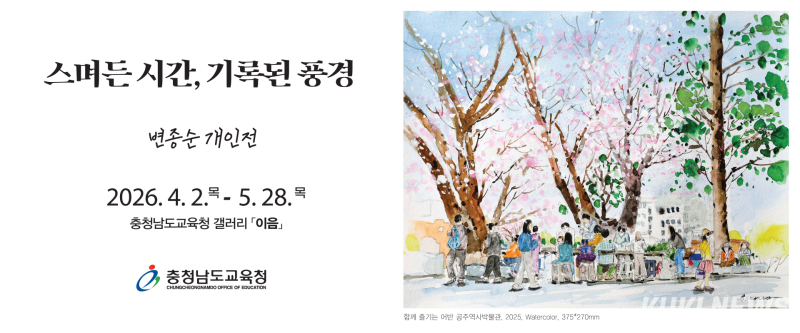 변종순 개인전. 충남교육청은 오는 2일부터 다음달 28일까지 충남교육청 별관 1층 갤러리 이음에서 변종순 작가(공주고 교무행정사)의 첫 개인전 ‘스며든 시간, 기록된 풍경’을 개최한다고 밝혔다.
