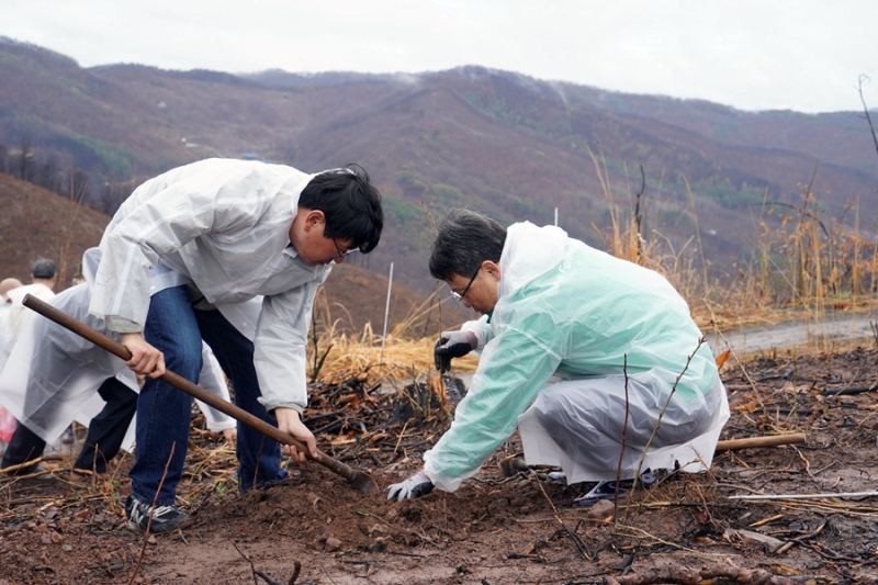 이날 박 청장과 참석자들은 산초나무와 산벚나무 등 1000그루를 심으며 건강한 숲 조성과 산불피해지 복원에 힘을 보탰다.