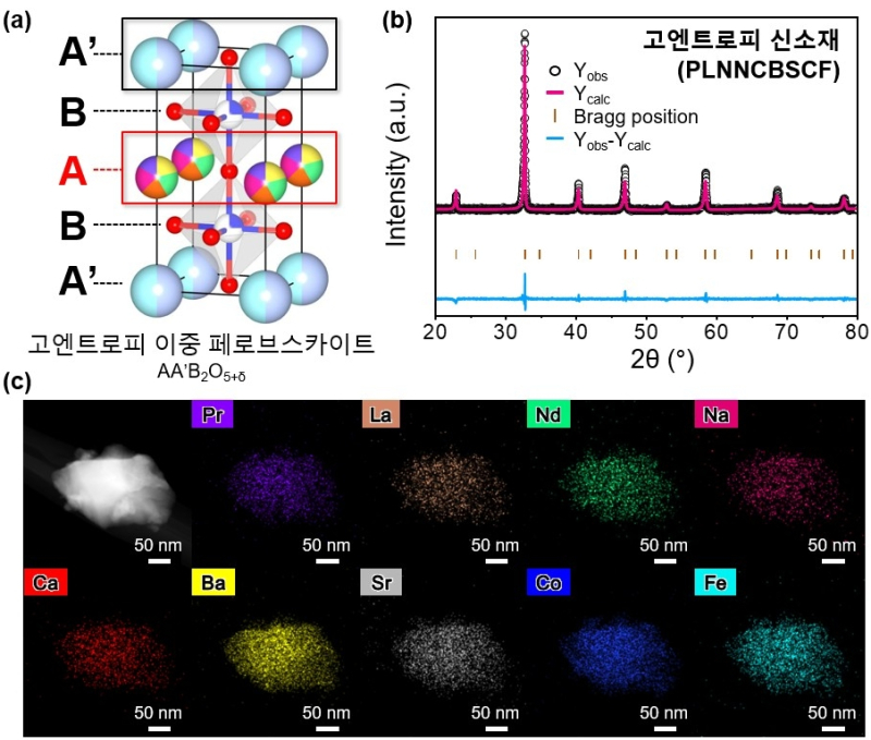 연구팀은 전극 구조 금속원소 자리에 프라세오디뮴(Pr), 란타넘(La), 나트륨(Na), 네오디뮴(Nd), 칼슘(Ca), 바륨(Ba), 스트론튬(Sr) 등 7종 금속을 동시 도입한 ‘고엔트로피 이중 페로브스카이트 산소전극’을 설계했다.