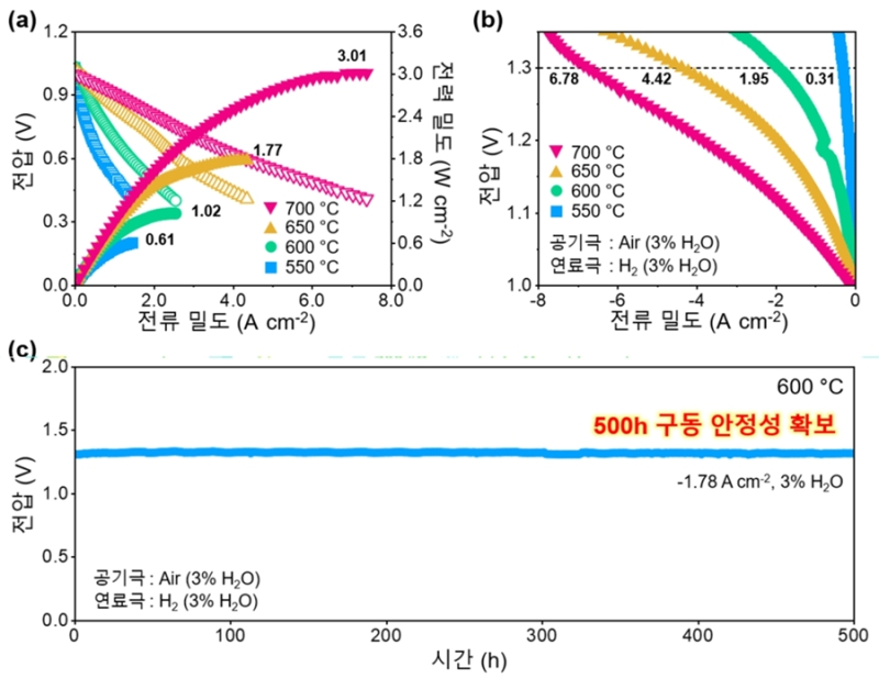 이를 종합한 성능실험 결과 새 전극을 적용한 전지는 650℃에서 1.77W/cm²로 기존보다 2.6배 높은 전력 밀도를 기록했다.